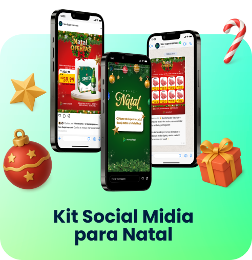 Peças prontas para redes sociais para você turbinar as redes sociais do seu supermercado neste fim de ano. Com nosso kit de modelos prontos, seu supermercado ganha agilidade, presença nas redes e se destaca em meio à concorrência com uma comunicação visual alinhada às festas.